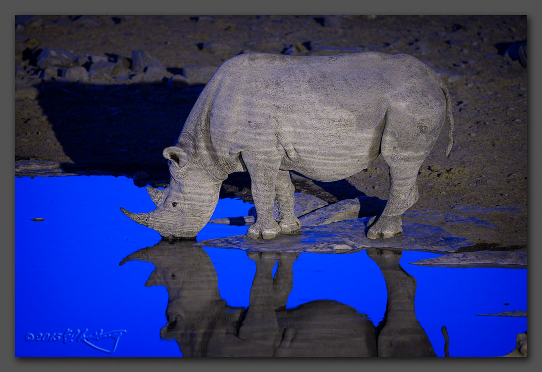 4. Black Rhino at dusk at the Hilali watering hole. The light here is from a spotlight. This was taken at 500mm f/4 ISO 6400 1/6 second with mirror lockup and cable release. I wanted to change to the 100-400 to get more of the reflection, but I was afraid that 1/3 second would just be too long. As it is, you can see motion blur in the near ear of the rhino. The sky obviously did not appear that blue during the photo, but rather it was a deep indigo. I did not mess with the way it came out at all, however.