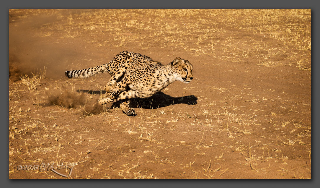 1. Cheetah - full tilt. This was taken at the Conservancy. This is one of the4 \"ambassador\" cheetahs that they have. They are all siblings that were taken in by the Conservancy when their mother was killed. They are not tame, but they are used to people. We were in the enclosure with them when they were being exercised and at times they were very, very close to us. This photo was taken with my 28-7fmm lens at 75mm! Though I wanted to get low for a better perspective, I was warned not to as it my make me appear to be prey. I stayed standing up