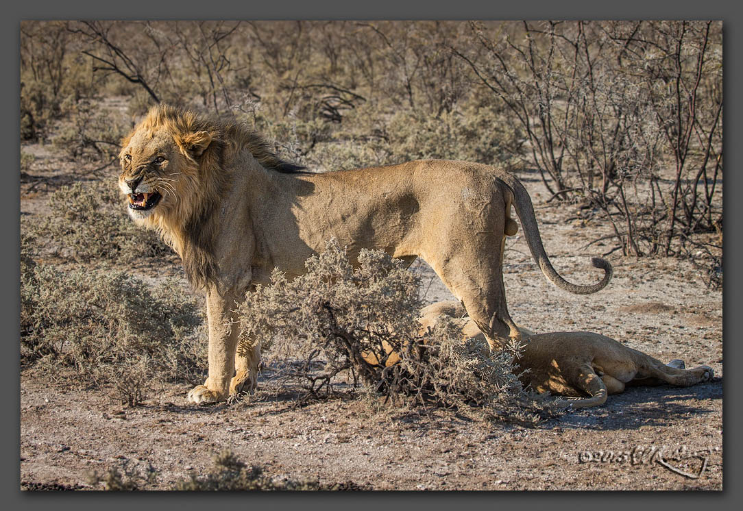 7. Lion stands over lioness. Shortly before we came across the mother & child rhinos, we came upon a lion and lioness doin\' what the birds and the bees do. We stayed for quite a while as their amorous moments were numerous with short rest periods between. Once again the light was not great, but check out the focal lengths - we were very close!
