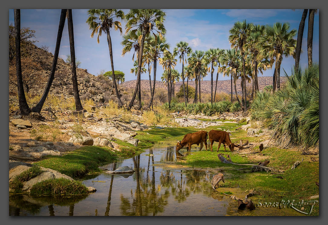 9. Makalani Palms along a Namibian river. OK, so this isn\'t strictly wildlife, though it might count as nature. The scene was simply striking, however, especially as it was one of the very few places where we saw any green. The palms are not indigenous to Namibia. The Brahma Bulls were a bonus