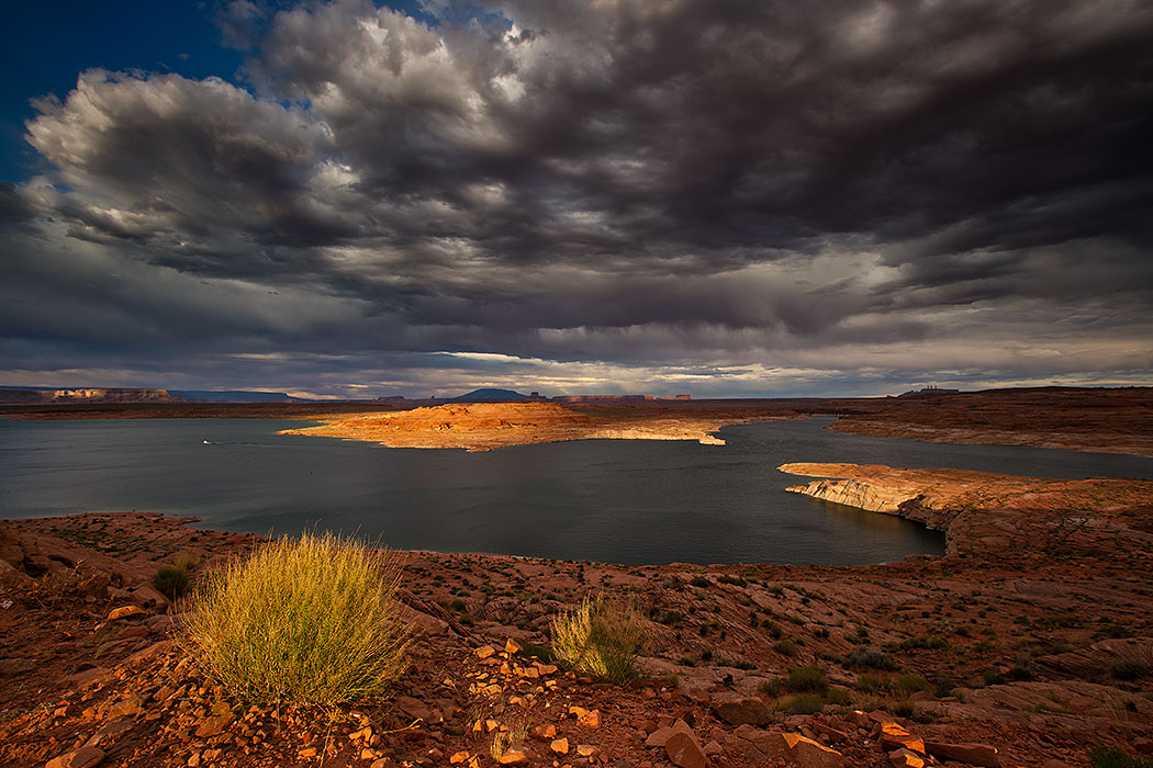 Last sunlight of the day on Lake Powell with stormy skies
